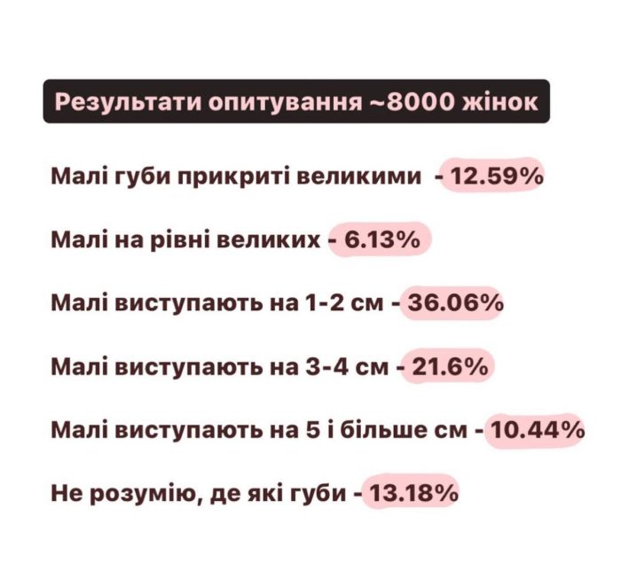 Це нахабна брехня. Дослідження щодо розмірів статевих губ, показують, що так звана «норма» – виключення із правил. У жінок довжина labio minora – від 2 до 10 см. У середньому – 6 см. І тільки у 12-18% жінок вони справді не виходять за межі «великих».