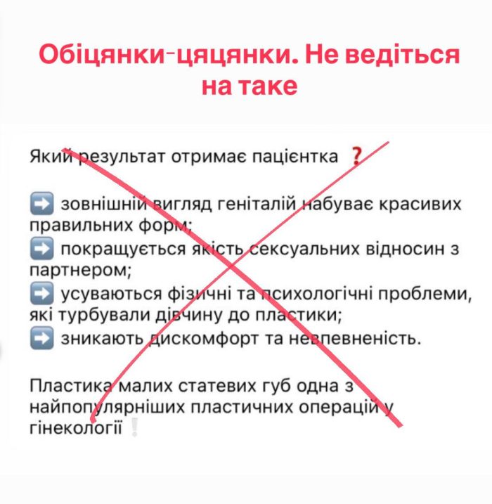 Звісно, хитріші лікарі кажуть, що роблять операції не з естетичною метою, а тільки у випадку, якщо у жінки є скарги. Проте це все одно нахабна брехня, бо для операцій за скаргами не потрібна агресивна реклама у соцмережах (спробуйте в інстаграмі в пошуковику ввести слово “лабіопластика” і подивіться, скільки таких дописів!). Чи видаляють людям якісь органи або їхні частини? Звісно. Але робиться це тільки тоді, коли є загроза для життя й здоров’я. Ніхто не рекламує видалення нирки, шлунку, кишківника чи ампутацію руки. Проте дуже зручно рекламувати те, що приносить тобі надприбуток через невеликі зусилля.