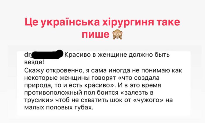 - “Була на навчанні в пластичного хірурга, який зауважив, що мені як гінекологу треба лиш зробити зауваження про довжину губ, пігментацію під час огляду, і більшість таки прийде на операцію. Відбив охоту до таких операцій назавжди!”