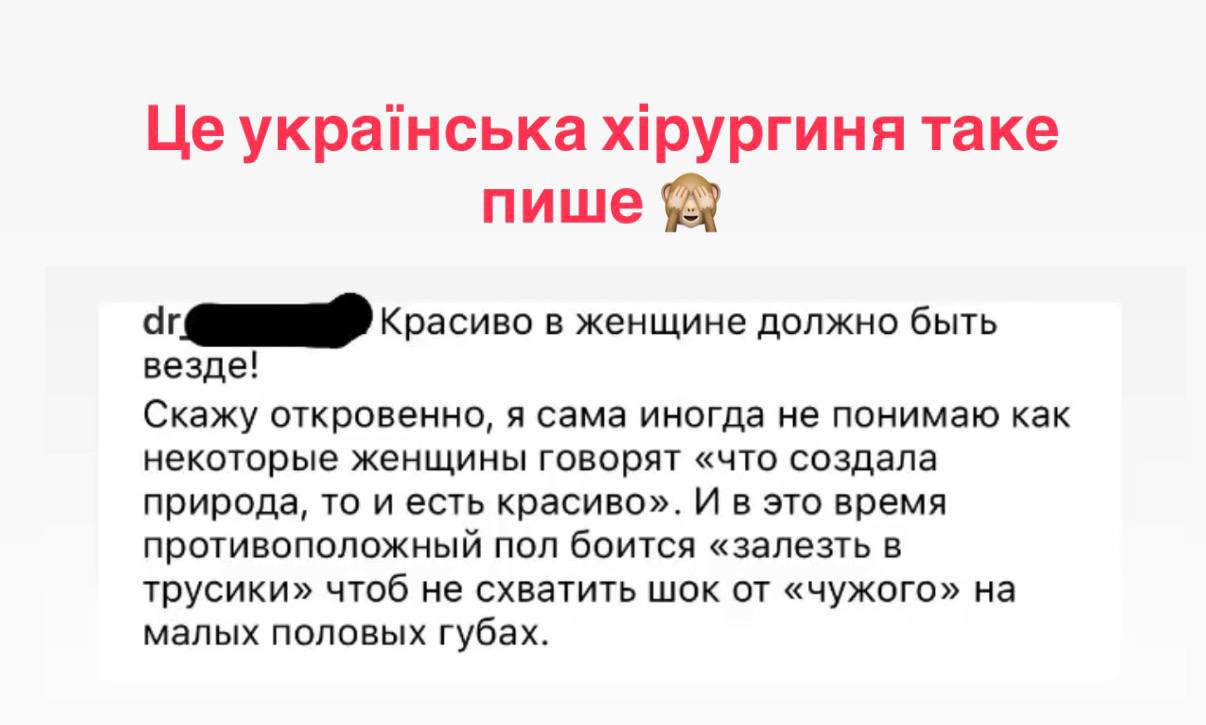 - “Декілька днів тому була на прийомі у гінеколога в приватній клініці. Лікар-чоловік під час огляду спитав, чи не заважають мені малі статеві губи. Сказала, що абсолютно комфортно і в житті, і під час сексу. Відповідь лікаря: “Це неестетично, і під час сексу може заважати”. Я посміялась, ще раз повторила, що мені нормально. Закінченням цієї історії була рекомендація в “лабіопластика у плановому порядку”. І наче, все нормально, я розумію, що у мене все добре, і ця операція не потрібна. Проте вийшла з клініки зі сльозами на очах і думкою, що зі мною, щось не так”